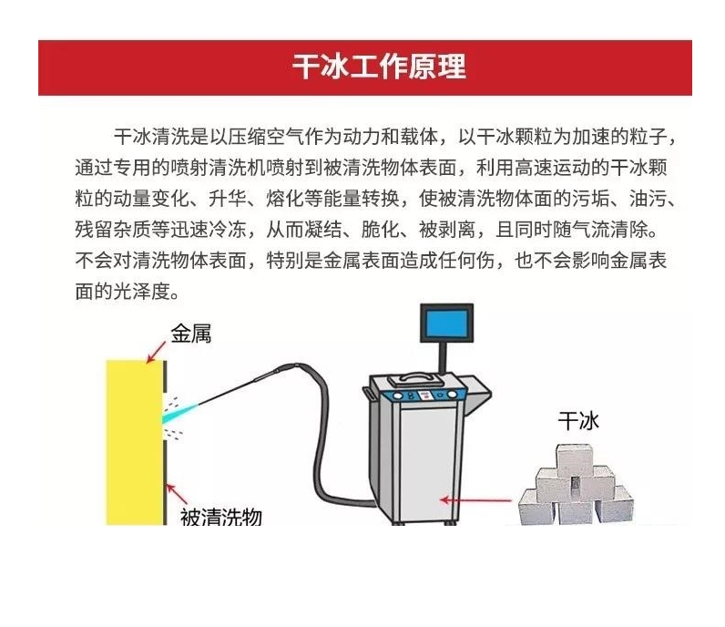 干冰是固态二氧化碳。可以说,干冰是一种很好的清洗原料。目前,干冰清洗技术已广泛应用于各大行业,清洗效果也很好。很多人都想知道干冰清洗的原理是什么,所以我们来介绍一下干冰清洗的原理,主要体现在以下几个方面。